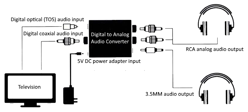 One side of the DAAC connects to the television via a Digital Optical or Digital Coaxial cable and the other side has sockets to connect into an Analog 3.5mm or RCA plug/s.